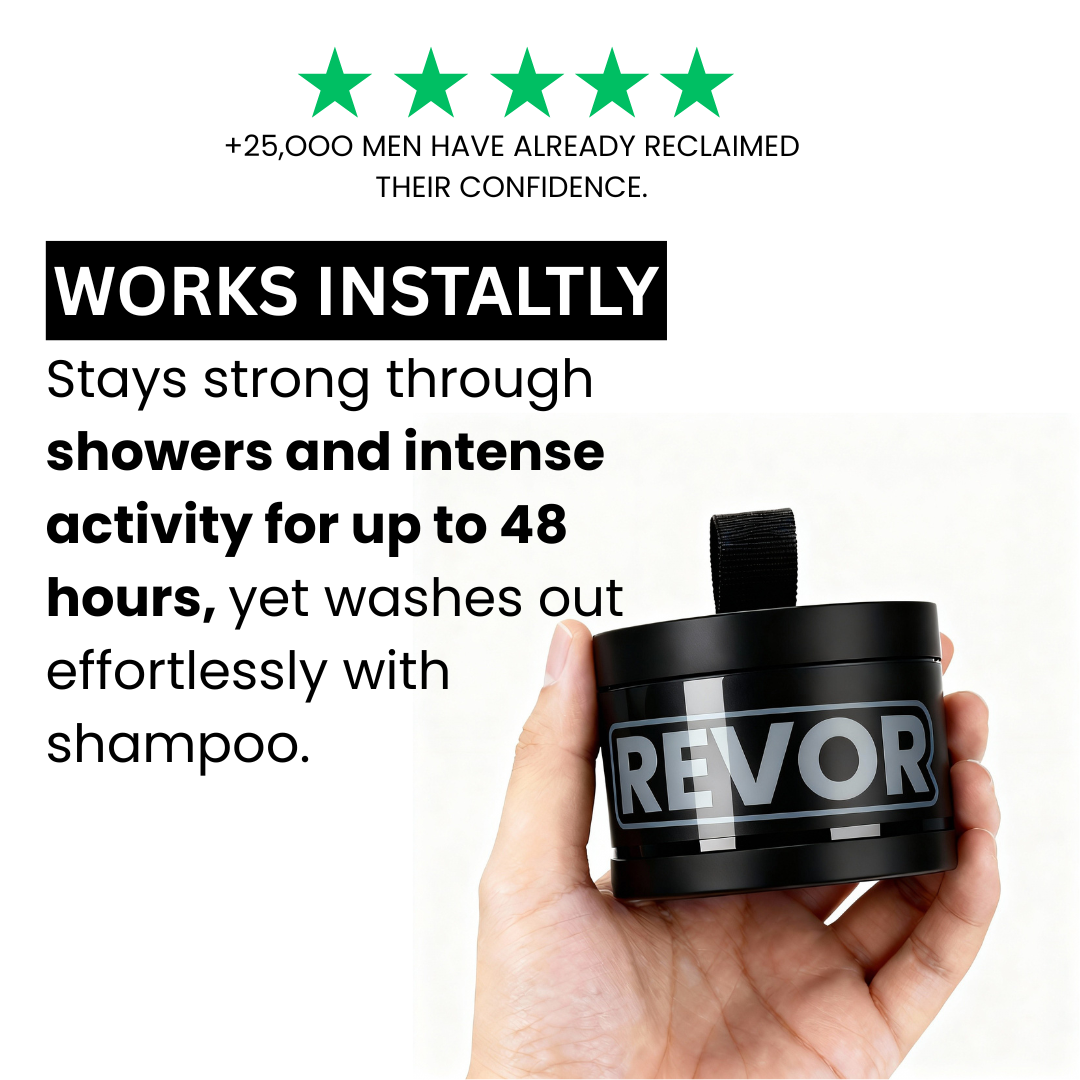 Stop hiding under hats — Revor Fill™ makes thin spots vanish instantly, leaving a natural, thicker look that lasts all day.